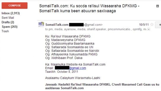 FG: Oct 8, 2011 ayaa SomaliTalk emailkaas waxay u dirtay prof. Gaas