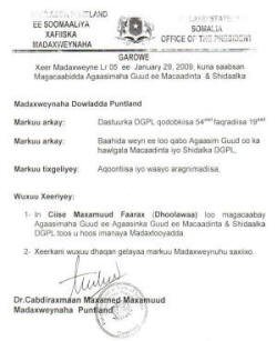 Janaayo 29, 2009: Wareegto uu soo saaray madaxweynaha DGPL, Dr. C/raxamaan